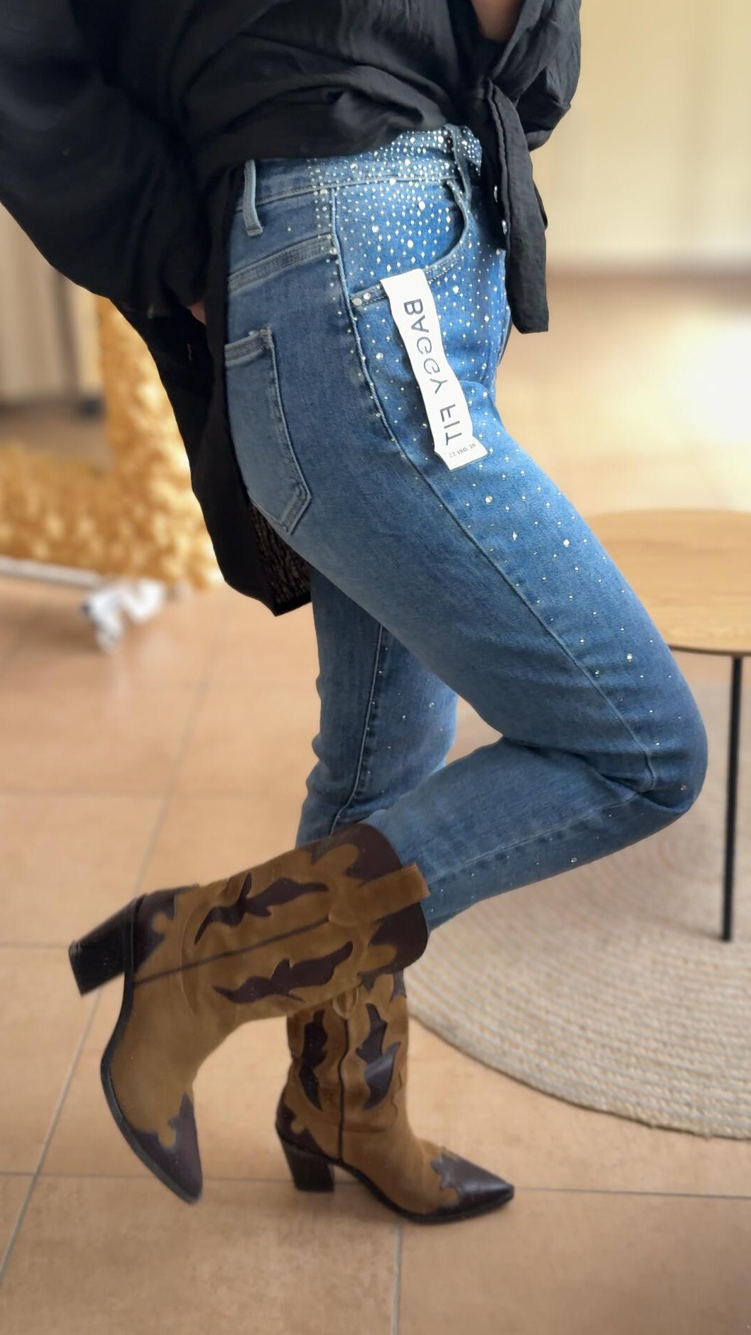 Farmerke s elastinom – udoban kroj koji lijepo prati liniju tijela. Klasičan plavi denim ukrašen sitnim kristalnim detaljima donosi dašak glamura u svaki outfit. Idealne za svakodnevne kombinacije, ali i za večernje prilike kada želite zasjati.