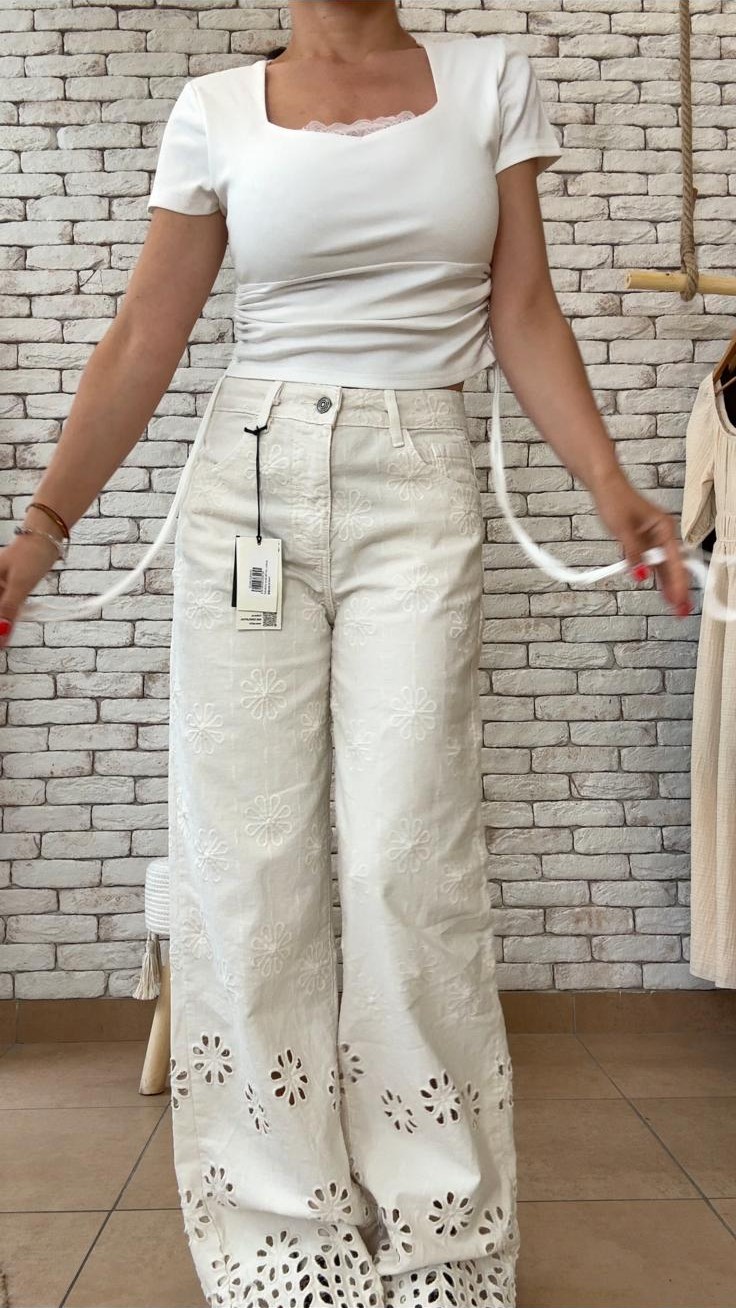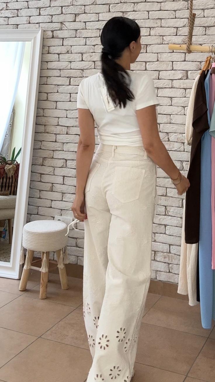Farmerke koje odmah privlače pažnju — model sa širokim, opuštenim krojem i sitnim svjetlucavim detaljima koji daju suptilan, ali upečatljiv efekt. Lagani denim u svijetloj nijansi donosi svježinu i lakoću svakom outfitu, dok kroj daje potpunu slobodu pokreta i modernu siluetu.